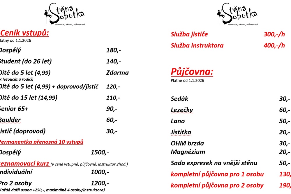 Od 01.01.2026 vchází v platnost nový ceník služeb lezecké stěny. Bliží informace najdete v příloženém obrázku, sekci "ceník" webových stránek, případně na recepci lezecké stěny.