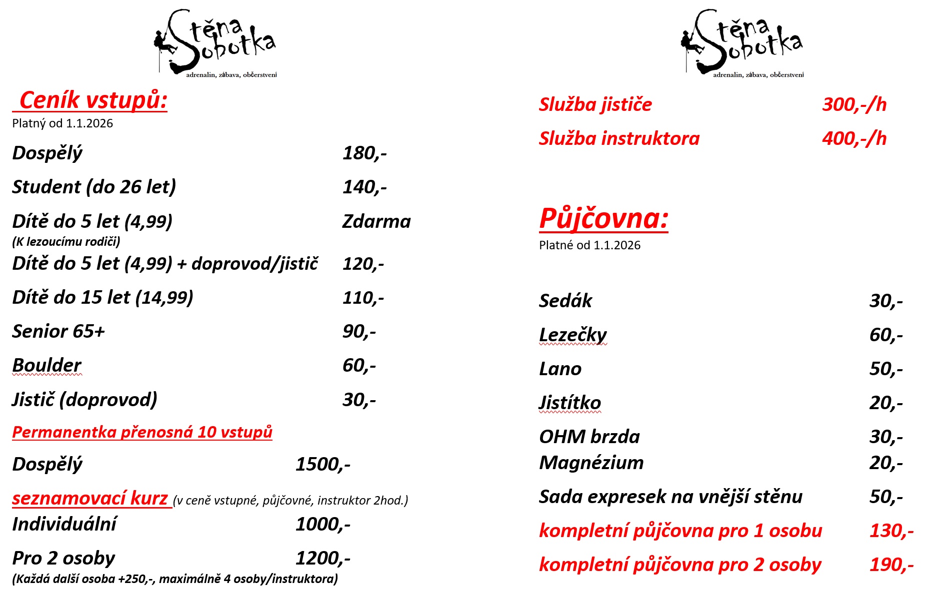 Od 01.01.2026 vchází v platnost nový ceník služeb lezecké stěny. Bliží informace najdete v příloženém obrázku, sekci "ceník" webových stránek, případně na recepci lezecké stěny.