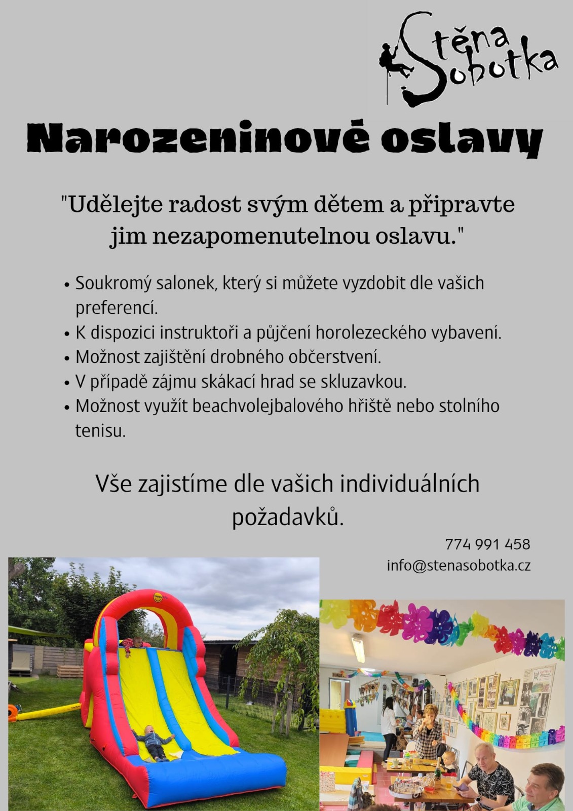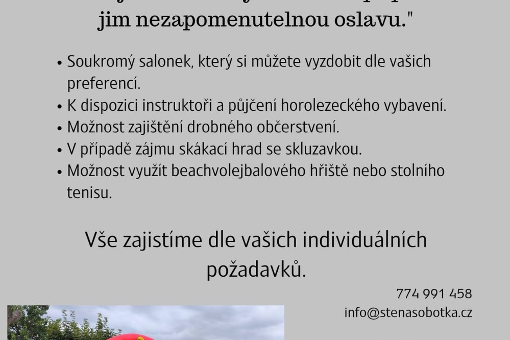 Dopřejte svým dětem oslavu, na kterou jen tak nezapomenou. Čeká na vás soukromý salonek, horolezecké dobrodružství s instruktory, občerstvení, skákací hrad se skluzavkou i sportovní zábava na beachvolejbalovém hřišti nebo u stolního tenisu.